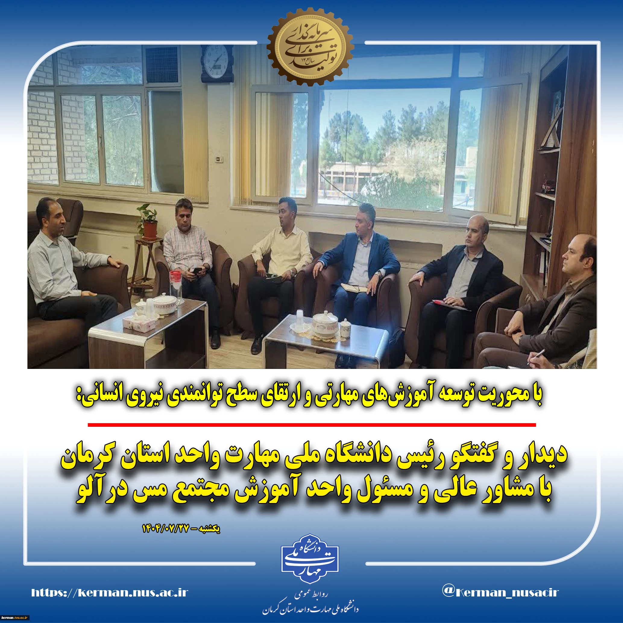 با محوریت توسعه آموزش‌های مهارتی و ارتقای سطح توانمندی نیروی انسانی: دیدار و گفتگو رئیس دانشگاه ملی مهارت واحد استان کرمان با مشاور عالی و مسئول واحد آموزش مجتمع مس درآلو 2